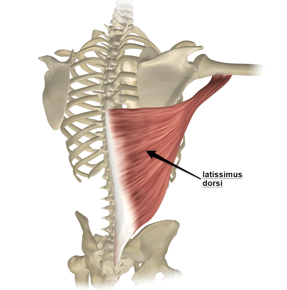 The latissimus dorsi, or better known in the gym as the “lats,” are big powerful muscles that connect all the way from the hip and mid/low back to the upper arm. You can see from the picture below that they take up a lot of real estate on your body: